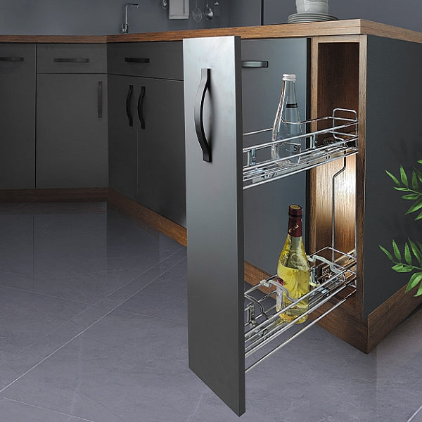 Ausziehbares Flaschenregal für Küchenunterschränke aus verchromtem Stahl, ideal für kleine Räume oder Beistellschränke. Einfache Installation: Befestigung an der linken Seite des Geräts und vollständige Einstellung der Tür. Die Struktur besteht aus verchromtem Stahl mit 2 Ebenen und verfügt über Rollenführungen mit Totalauszug und sanfter Schließung, die ein sanftes Gleiten des Systems ermöglichen und ein Zuschlagen verhindern. Der untere Korb hat 4 Fächer für die Organisation von Flaschen. Tragfähigkeit bis zu 30 kg.