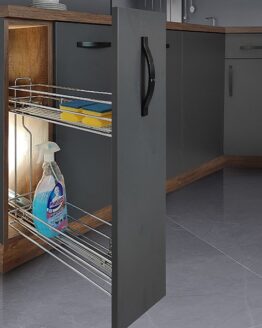 Ausziehbares Flaschenregal für Küchenunterschränke aus verchromtem Stahl, ideal für kleine Räume oder Beistellschränke. Einfache Installation: Befestigung an der linken Seite des Geräts und vollständige Einstellung der Tür. Die Struktur besteht aus verchromtem Stahl mit 2 Ebenen und verfügt über Rollenführungen mit Totalauszug und sanfter Schließung, die ein sanftes Gleiten des Systems ermöglichen und ein Zuschlagen verhindern. Der untere Korb hat 4 Fächer für die Organisation von Flaschen. Tragfähigkeit bis zu 30 kg.